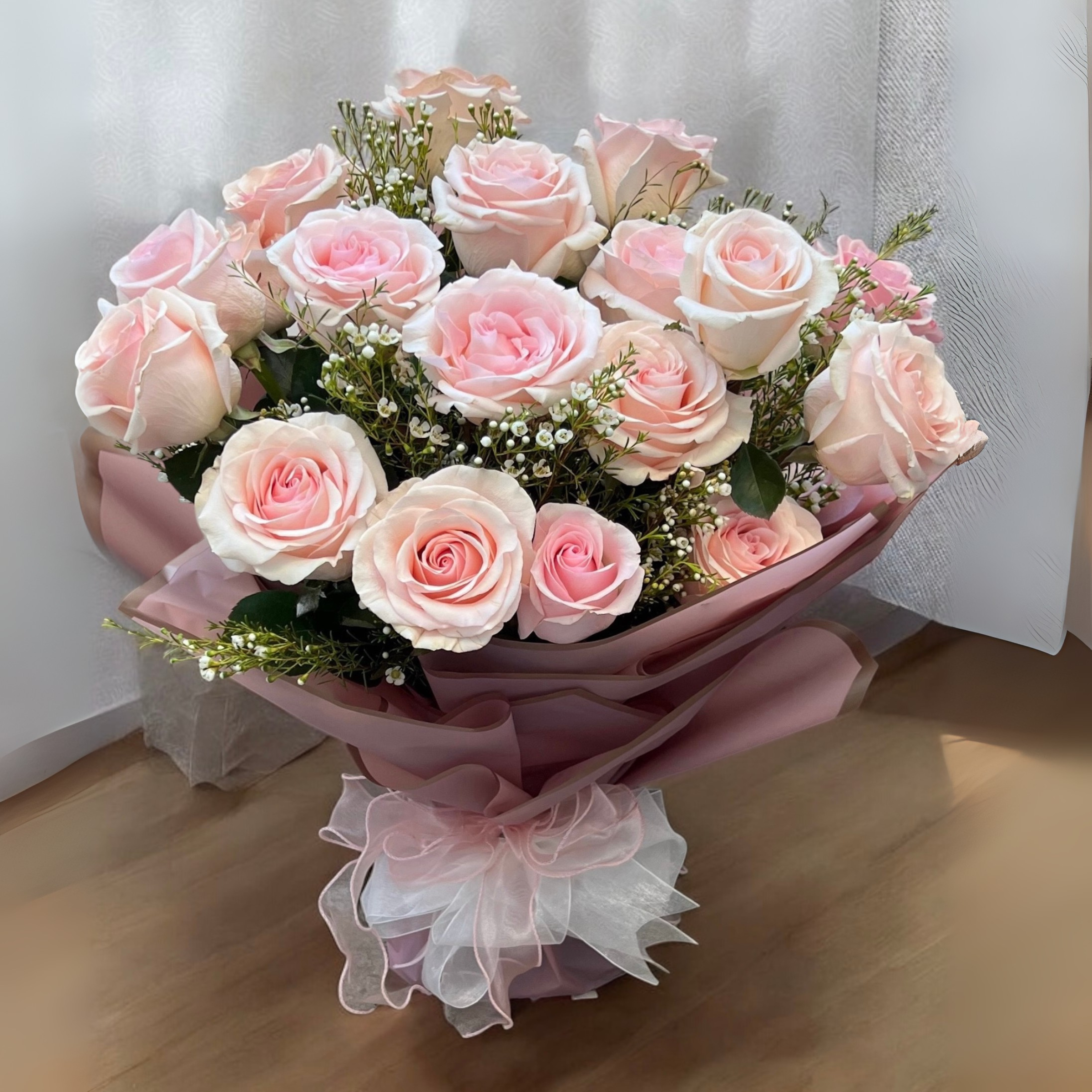 A beautifully arranged bouquet featuring 25 roses and wax flowers, elegantly wrapped, perfect for any special occasion.