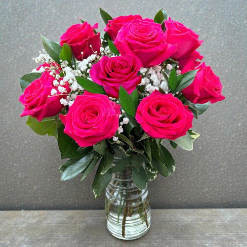 A classic arrangement of 12 fresh roses, accented with greenery and baby’s breath. Designed with timeless elegance, perfect for any occasion.