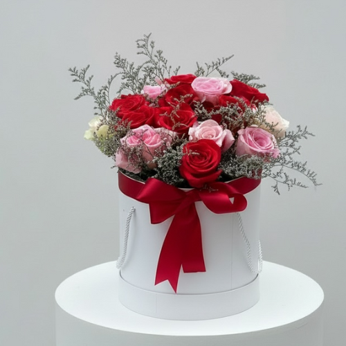 A charming box arrangement featuring 12–14 premium roses in a beautiful mix of soft and vibrant hues, accented with delicate seasonal fillers. Thoughtfully designed for a fresh, elegant look—perfect for gifting or brightening any space.
