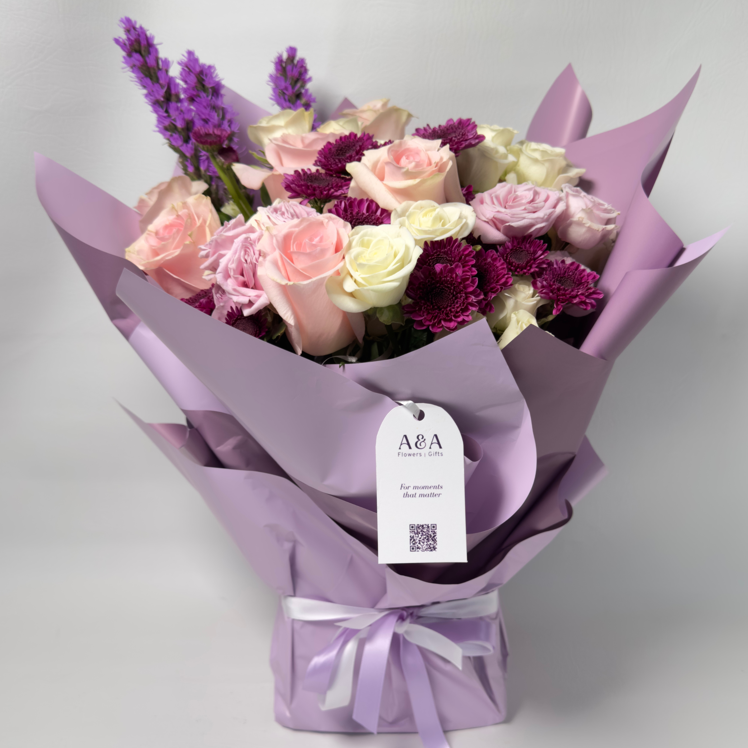 A delicate mix of pink, purple, and lavender roses paired with soft filler flowers, beautifully wrapped in lilac paper. Contains 14–16 stems for a lush, elegant presentation