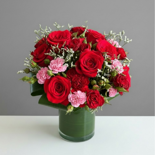 A classic round arrangement featuring roses and mini carnations, accented with soft seasonal fillers and designed in a 6” clear glass vase. Styled in a full, rounded shape for a fresh and balanced look.