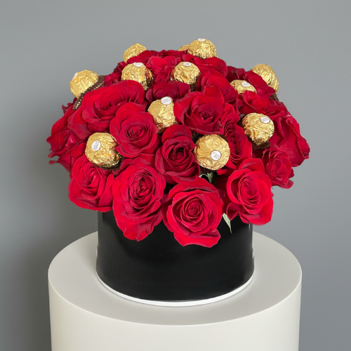 22-24 fresh premium roses beautifully arranged in a luxury box, paired with 10 Ferrero Rocher chocolates for the perfect touch of sweetness. A stunning combination of elegance and indulgence, ideal for celebrating love,