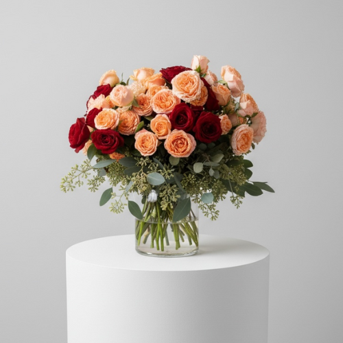 A modern arrangement featuring 10-12 stems of spray roses paired with fresh eucalyptus, designed in a 6″ cylinder vase. Created using two complementary colors for a soft yet elegant look.